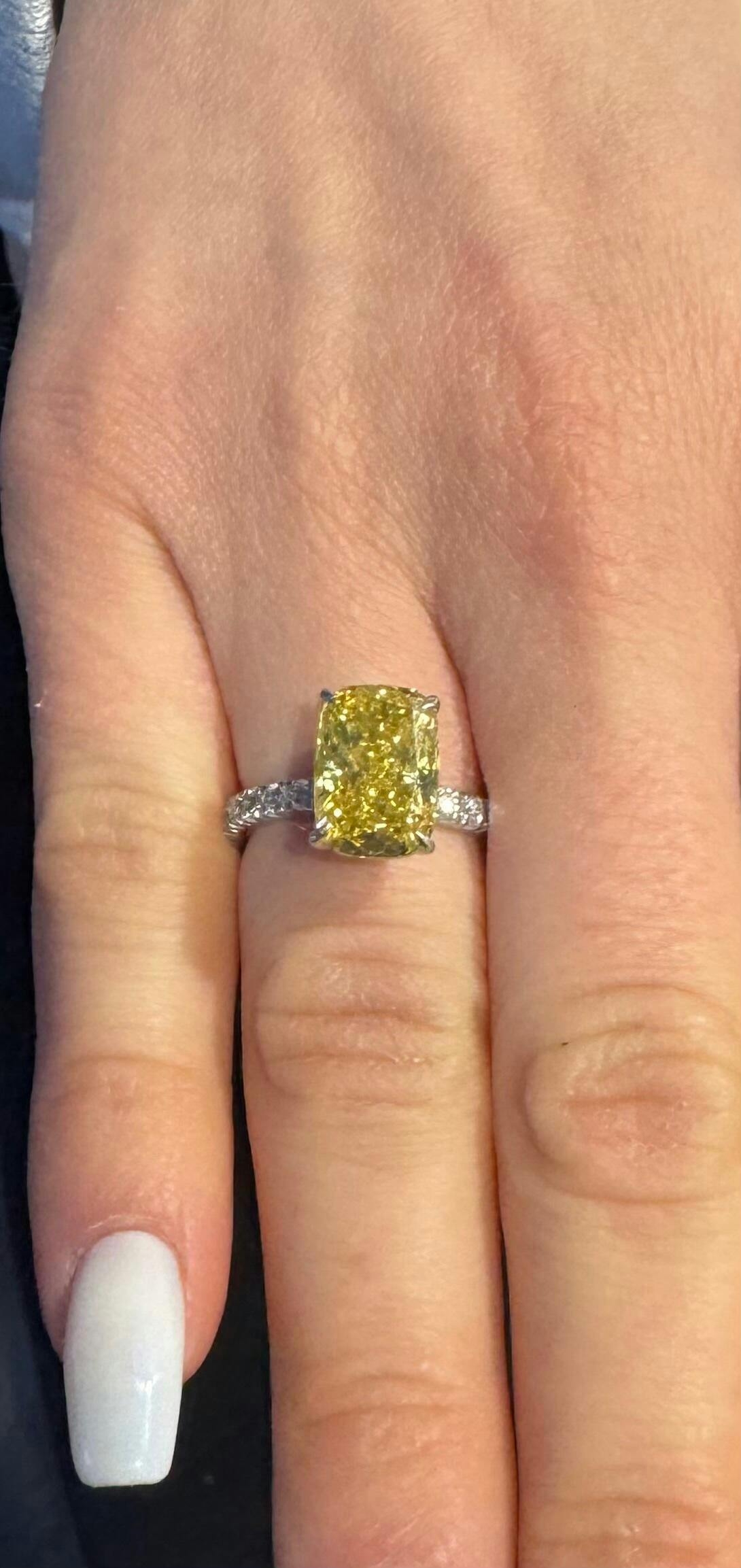 This 4.59ct Fancy Vivid Yellow diamond ring radiates rare energy. The center stone carries a deep golden hue with remarkable brightness, elevated by a clean VS2 clarity grade and certified brilliance.